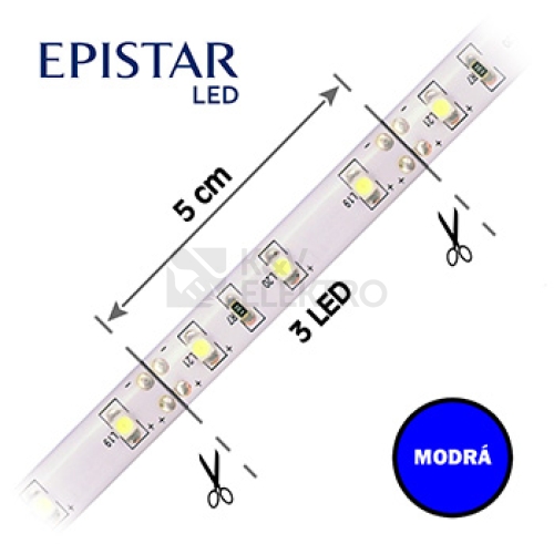 Flexibilní pásek s LED SMD diodami, efektivně vyzařujícími světlo, je vhodný pro dekorativní nasvícení interiérů, náročné osvětlovací systémy, ale i pro reklamní účely. Velkou předností je velká svítivost a napájení malým napětím 12 V DC (příp. 24 V DC, dle typu) a snadné ovládání pomocí volitelných ovladačů, kontrolérů a stmívačů. Díky sério-paralelnímu zapojení lze pásek jednoduše dělit po jednotlivých modulech. Pro snadnou montáž je jedna strana pásku opatřena oboustrannou lepící páskou firmy 3M.Technické parametry: Příkon (max.): 4,8 W/m Světelný tok: 120 lm/m Vlnová délka: 470 nm (modrá) Počet LED/m: 60 LED/m Typ LED čipu: 3528 Výrobce LED čipu: Epistar Vyzařovací úhel: 120° Index podání barev: Ra > 80 Krytí: IP65 Pracovní teplota: -25 °C až +50 °C Napájecí napětí: 12 V DC Počet LED / Délka modulu: 3 LED / 5 cm Rozměry: 10 x 3 mm Balení: 5 m