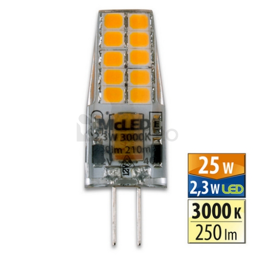 LED žárovka capsule 2,3W (ekvivalent 25W), patice G4, 12V, 3000K - teplá bílá, světelný tok 250lm, vyzařovací úhel 300°, CRI>80, úspora až 85%, životnost až 25.000 h, 12.500 spínacích cyklů, A+, rozměry ø 13 x 37 mm, nestmívatelná