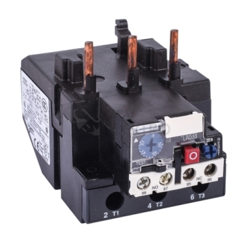 TeSys LRD -jisticí nadproudové relé - 50A/1000V - rozsah nastavení teploty 37-50A - třída vypnutí 10A - pro ochranu 3fázových motorů 22kW@400V. Rozdílové zařízení s poruchou fáze a detekcí nerovnováhy zatížení. Poskytuje to resetovací volbu teploty, manuální-automatický reset přepínač, který funguje také jako reset tlačítko, vypínací tlačítko pro simulaci vypnutí, tlačítko Stop, indikátor příznaku a 2 pomocné kontakty 1Z+1V pro signalizaci poruchy. Nastavení jsou chráněna průhledným krytem uzamykatelným zapečetěním. připojení šroubovými svorkami se přímo připojuje ke spodním svorkám 3-pólových stykačů LC1D80-D95. Montáž na lištu DIN nebo šroubové upevnění, oddělená od stykače, s pouitím svorkovnice LA7D3064 (objednat samostatně). Certifikováno více standardů (IEC, UL, CSA, CCC, ATEX, Marine), splňuje požadavky norem Green Premium (RoHs/Reach).