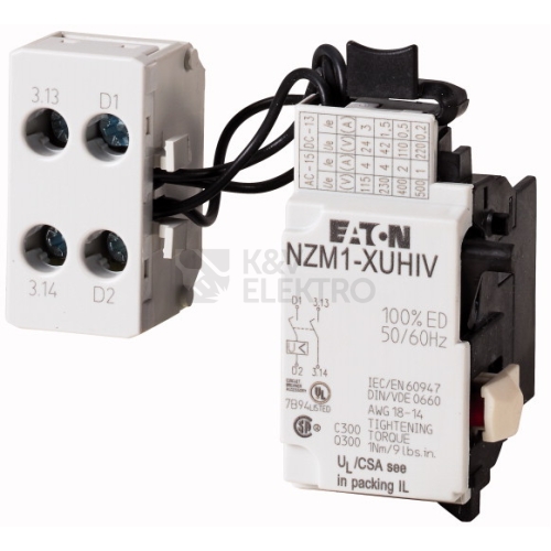 Volitelné příslušenství k řadě výkonových spínačů NZM nabízí bohaté portfolio možností využití při nasazení na celém světě. Montáž je vždy pružná a jednoduchá díky modulárním funkčním skupinám. Upozornění: k předbíhajícímu připojování podpěťové spouště při použití hlavního vypínače a také pro blokovací obvody a obvody ke snížení zátěže. Lze použít pro zařízení nouzového vypnutí ve spojení s tlačítkem nouzového vypnutí. Jestliže vypínací spoušť vede napětí, brání bezpečně dotyku hlavních kontaktů spínače při pokusech o zapnutí. Předbíhání pomocných kontaktů při zapínání a vypínání (ruční ovládání) cca 20 ms. Podpěťovou spoušť nelze instalovat současně s předbíhajícím pomocným spínačem NZM..-XHIV.. ani vypínací spouští NZM..-XA.. Lze použít pro: NZM1(-4), N(S)1(-4)
