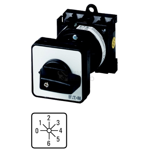 Vačkové spínače podle ČSN/EN60947, konstrukční velikost T0, forma zadní montáže na DIN lištu, upevnění k podlaze se západkou a šroubem, pohon se spojkou pro dveře nebo víko, přední štítek 48x48, stupeň krytí vpředu IP65 s černou pákou, jmenovitý trvalý proud Iu 20 A, jmenovité provozní napětí Ue 690V, příslušenství k dodání podle údajů v katalogu Vačkové spínače T. Konstrukční formy všeobecně: skříňky pro povrchovou montáž z izolačního materiálu, montáž, centrální upevnění, základní montáž, montáž do rozváděče IVS