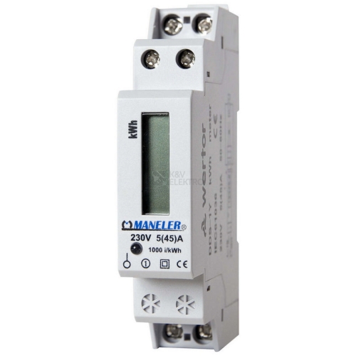Elektroměr MANELER 9901D přímé měření 5-45 A. Malý elektroměr určený k montáži na DIN lištu. Vhodný pro připojení k výrobkům SDS. Parametry: proudový rozsah: 5 až 45 A náběhový proud: 0,025 A LCD displej třída přesnosti_ 1 montáž na lištu DIN šířka 1 modul (17,5mm) impulsní výstup S0 (také LED): impulsní konstanta 1000 imp. na 1 kWh spotřeba: 0,4 W zpětná brzda: ne