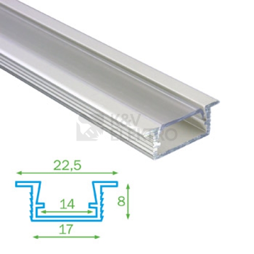 AL profil určený pro osazení LED pásky. Pásek se jednoduše nalepí do profilu a profil se osadí podle typu do vyfrézované drážky, přisadí se, nebo zavěsí. Profil zároveň plní funkci chlazení (odvod ztrátového tepla) což je nutné u výkonných LED páskůTechnické parametry: Typ: FKU02-1M Maximální šířka LED pásku: 14 mm Délka: 1 m Rozměry (š x v): 22 ,5 x 9 mm Dodáváno včetně krycího matného plexi s propustností 75%