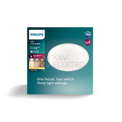 Ultratenké stropní svítidlo Clear z kolekce domácího osvětlení Philips ve větším provedení o průměru 30 cm díky funkci SceneSwitch umožňuje vybírat mezi třemi úrovněmi jasu teplého bílého světla. To vše pomocí přepínání stávajícího nástěnného vypínače, není třeba instalovat stmívač. Štíhlé tělo svítidlo o šířce pouhých 2,3 cm působí velice nenápadně a elegantně a je vhodné pro interiéry s nízkým stropem. Plastoví stínidlo rovnoměrně vyzařuje světlo s teplotou chromatičnosti 2700K, které je díky technologii EyeComfort šetrné k vašim očím. Světlo poskytuje integrovaný LED zdroj o maximálním příkonu 1 x 18 W a životností až 15.000 hodin, který je součástí svítidla a nelze ho vyměnit. Krytí IP20 vyjadřuje vhodnost pro použití do interiéru.