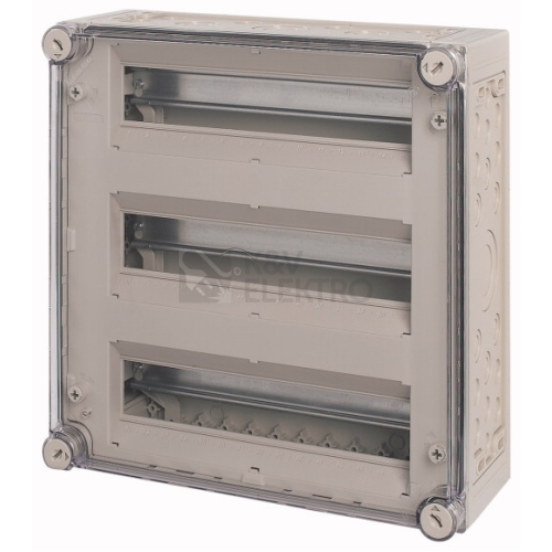 Individuální kryt automatu, material: Polykarbonát, odolný proti nárazům, stupeň krytí IP65, metrické vylamovací otvory ve všech boč nicích, vestavné přístroje konstrukční velikosti 1 podle normy DIN 43880, kryt průhledný se zamykacími rukojeťmi, průhledné dveře k obsluze vestavných přístrojů, DIN lišty k uchycení přístrojů, zaslepovací pás do nepoužívaných vestavných míst, krycí panel s popis ovacím páskem, sběrnice PE/N včetně, upevňovací oka k upevnění na stěnu, upevňovací šrouby s možností plombování, počet HP=45, svorky PE a N, počet x průřez=po 4x(6-35) mm² a 20x(1-4) mm², provedení krytu: průhledné, provedení dveří: žádné