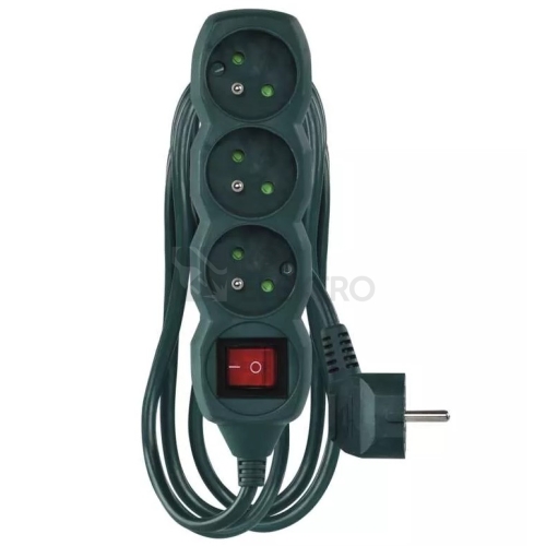 Zelený prodlužovací přívod, 3 zásuvka s vypínačem, délkou 3 m a průřezem vodiče 1,5 mm2. Vhodný pro maximální zátěž 16 A max. Montážní otvory pro přichycení zásuvky na zeď. Prodlužovací přívod 3 m na 230 V~ slouží k prodloužení elektrické energie tam, kam pevná zásuvka nedosáhne. Při montáži na stěnu je nutné použít vrut se zápustnou hlavou PZ max. průměr 2,5–3 mm, délka 30–40 mm. V případě použití jiného průměru hrozí poškození plastové části otvoru. Pokud dojde k poškození plastové části otvoru, prodlužovací přívod nepoužívejte.