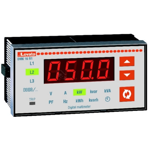 Panelový multimetr, nerozšiřitelný, třífázový, fázová a sdružená napětí, fázové proudy, frekvence, účiník, činná energie kWh, jalová energie kVARh, počítadlo provozních hodin, výstupní relé pro limity měřených veličin