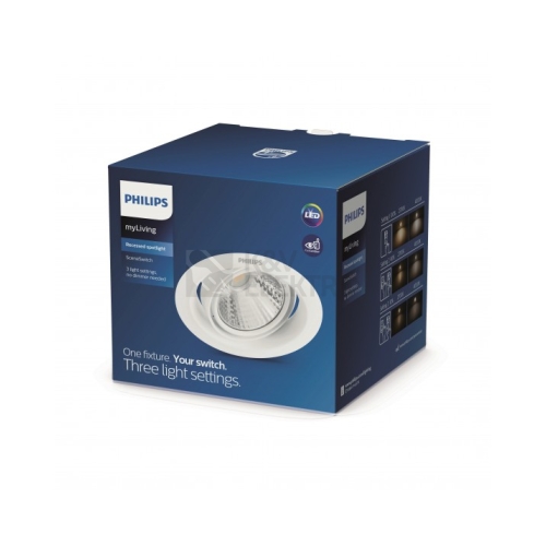 Moderní kulaté vestavné LED svítidlo Philips Pomeron o průměru 9 cm je vhodné pro instalaci do sádrokartonových podhledů s montážním otvorem o velikosti 7 cm. Pro jeho výrobu byl použit kvalitní bílý plast. Svit EyeComfort, který šetří vaše oči, má příjemný teplý bílý odstín s teplotou chromatičnosti 2700K a technologie Philips SceneSwitch umožňuje jej stmívat ve 3 intenzitách pomocí standardního nástěnného vypínače (není součástí dodávky). Zajišťuje ho integrovaný vysoce výkonný úsporný LED zdroj o maximálním příkonu 1 x 5 W se svítivostí 330 lm a s dlouhou životností až 15.000 hodin. Krytí IP20 určuje použití v interiéru bez zvýšené vlhkosti, není vhodné do koupelny.