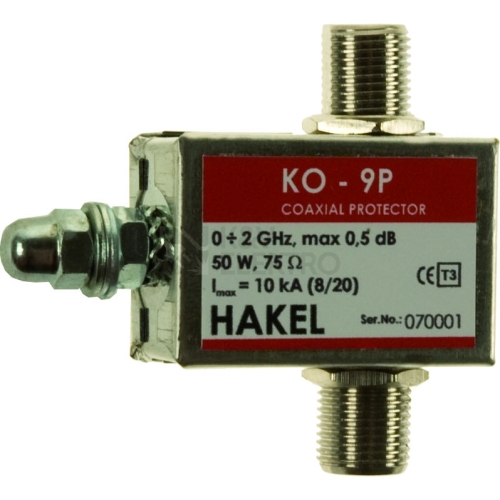 Koaxiální přepěťová ochrana KO-9P je určena k ochraně zařízení propojených s anténním systémem pomocí koaxiálních kabelů. Použitím s peciálních bleskojistek s maximálním výbojových proudem Imax(8/20) = 10 kA je zajištěna spolehlivá ochrana přijímacích a vysílacích systémů i proti účinkům blízkého úderu blesku. Pro použití v různých aplikacích nabízí firma Hakel široký sortiment koaxiálních ochran pro různé typy konektorů a pro odstupňované výkony. Doporučuje se pro použití na rozhraní ochranných zón LPZ 0A(B)-1 a výše podle ČSN EN 62305 ed. 2.