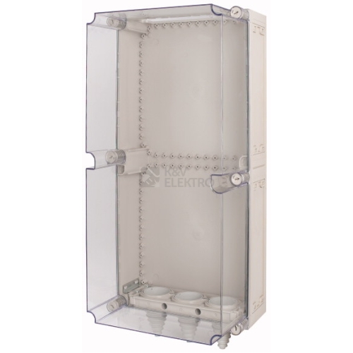 Skříňka s kabelovou přírubou s namontovaným kabelovým vývodem, material: Polykarbonát, odolná proti nárazům, stupeň krytí IP65, patentované upevňovací šrouby víka s integrovaným vyrovnáním přetlaku, bočnice uzavřené, vylamovací, stěny nahoře nebo dole otevřené, kabely lze vložit zepředu přes dělené kabelové spony, upevňovací šrouby s možností plombování, RAL 7032, štěrkově šedá (dolní část skříňky), průhledná, bezbarvá (víko), vestavná hloubka s montážním plechem=250 mm, provedení krytu: průhledné, provedení dolní části: nahoře otevřené, dole kabelové hrdlo