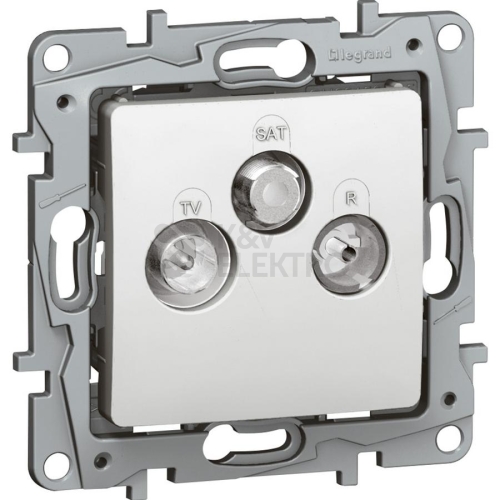 TV-RD-SAT zásuvka TV „samec" Ø 9,5 mm, 4 – 68 Mhz a 120 – 862 MHz. RD „samice" Ø 9,5 mm, 87,5 – 108 MHz. SAT typ „F", 950 – 2400MHz, umožňuje zpětný průchod proudu 500 mA DC. Koncová zásuvka pro průběžnou instalaci. Útlum 10 dB. barva: bílá