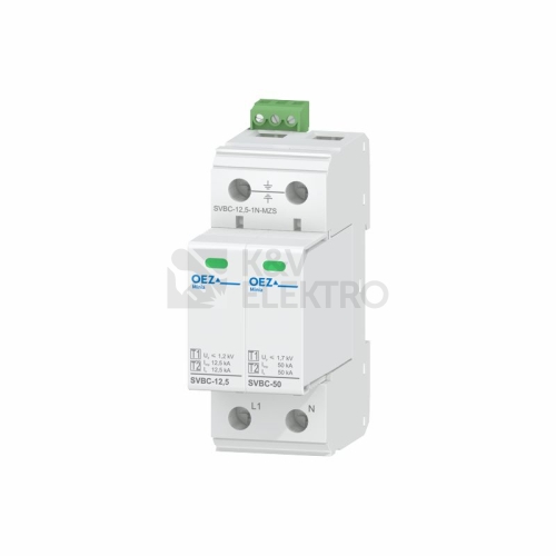 Kombinovaný svodič bleskových proudů a přepětí, typ 1+2, Iimp 12,5 kA, Uc AC 335 V, zapojení 1+1, výměnné moduly, se signalizací, varistor, jiskřiště