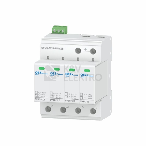 Kombinovaný svodič bleskových proudů a přepětí, typ 1+2, Iimp 12,5 kA, Uc AC 335 V, zapojení 3+1, výměnné moduly, se signalizací, varistor, jiskřiště