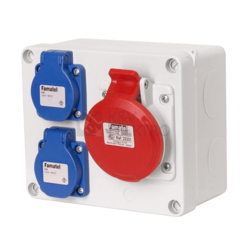 Krabice 3069 IP44 2x230V s ochr. kolíkem, 1x400V/16A/5, 170x140x90mm, hladké bokyZásuvková krabice s hladkými boky v krytí IP44, rychlá a jednoduchá montáž, odolnost proti mechanickým nárazům IK08, pro nástěnnou montáž (na omítku), barva šedá, samozhášivý, bezhalogenní UV odolný materiál, s připojovací svorkovnicí, otvory do krabice se provádějí vyvrtáním otvoru a následně se osadí vývodka (např. plastová šroubová M16 pro 230V okruh a M20 pro 400V okruh). Splňuje požadavky norem ČSN EN 60670-22, zkouška žhavou smyčkou 650°C (pro montáž na hořlavé podklady doporučujeme použití nehořlavé podložky), pro rozsah teplot od -25°C do +85°C.