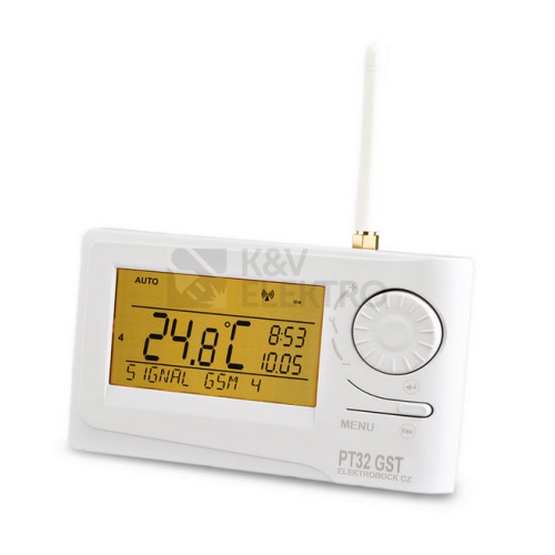 Kupte si inteligentní prostorový digitální termostat PT32 GST s implementovaným GSM modulem. Ten je vhodný i ke kotlům, které vyžadují bezpotencionální (beznapěťové) spínací kontakty (např. plynové kotle, elektrokotle, oběhová čerpadla, termoelektrické pohony nebo klimatizační jednotky). Do termostatu vkládejte sim karty typu MiniSIM (2FF). Termostat Elektrobock navíc nabízí intuitivní navigaci ve vybraném jazyku (CZ/PL/EN/DE/RU/SVK). Umožňuje 9 týdenních programů, 6 teplotních změn na den, programování po 10-ti minutách a 0.5 °C a možnost programování po dnech i týdnech. GSM termostat PT32 GST má velký podsvícený grafický displej. Nabízí možnost nastavení hystereze, PI regulace nebo PID regulace (ta nabízí vysokou přesnost bez trvalé regulační odchylky). Termostat umožňuje připojení externího čidla (není součást balení) pro hlídání teploty podlahy, funkci předčasné zapnutí topení, výběr režimu topení/chlazení, krátkodobou změna požadované teploty, korekci aktuální teploty, protizámrazovou ochranu (3 °C). Další výhody: manuální režim (MANU) trvalé vypnutí (OFF) režim DOVOLENÁ letní režim volba sudý-lichý týden zámek kláves suma provozních hodin kotle indikace údržby kotle funkce TEST automatická změna LETNÍ/ZIMNÍ čas servisní heslo napájení 5 V / DC, 2.5 A, typ AD05 - Jack (je součástí balení), nebo na objednávku zdrojem AD05-KU68 do instalační krabice záloha chodu hodin pomocí nabíjecích baterií 2 x 1,5 V/AA (nejsou součástí) výstup (bezpotenciální kontakt) max. 5 A / 250 V AC Podívejte se i na další kvalitní termostaty Elektrobock, případně zvažte pořízení termostatu s dotykovou obrazovkou. Vybírat můžete také z obdobných výrobků značek ABB, Schneider, Elko EP nebo Legrand. Prostorovými termostaty můžete efektivně regulovat například podlahové vytápění, elektrické přímotopy či akumulační kamna. Nezapomeňte si koupit kvalitní AA baterie. O společnosti Elektrobock Elektrobock je česká společnost, která vznikla v roce 1992 a od začátku se úzce specializovala na vývoj a prodej spotřební elektroniky pro domácnost. V sortimentu E1.cz najdete například domovní zvonky Elektrobock, termostaty, časové relé či pohybová čidla. Prohlédněte si kompletní sortiment této společnosti, který prodává náš e-shop.