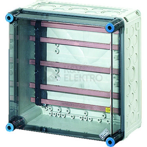 Skříně pro montáž kombinací energetických spínačů do 630 A nebo jako jednotlivé skříně. Z vysoce kvalitního polykarbonátu s ochrannou izolací. Stěnové průchodky s velkými otvory pro elektrické připojení skříní. Kabelové vstupy na všech stěnách skříní přes metrické předlisy nebo montážní příruby. Skříně pro upevnění na stěnu také pomocí vnějších patek nebo s montážními lištami. Rozvodnice s přípojnicemi, bez přístroje, bez svorek. Uzávěry víka otevíratelné pomocí nástroje.