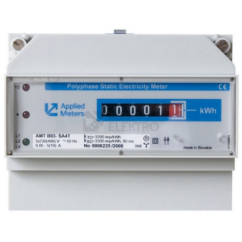 Třífázový jednosazbový elektroměr na lištu DIN, úředně ověřený s českým protokolem o ověření stanoveného měřidla, elektromechanický číselník, nepřímé měření x/5A