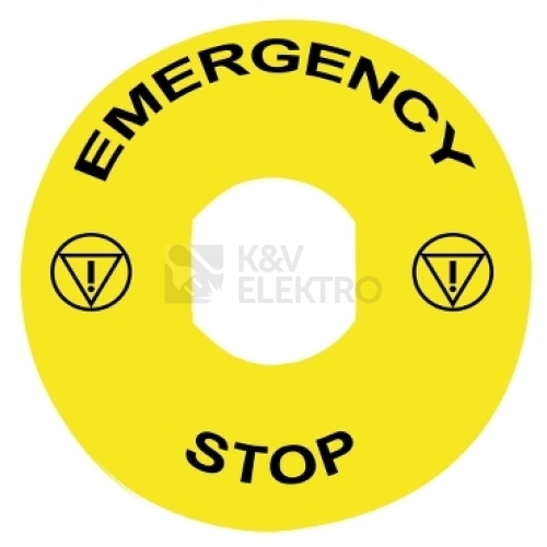 Tento kruhový štítek pro nouzové zastavení typu Harmony má žluté pozadí a je označen písmenem "EMERGENCY STOP"a průměrem 60 mm. Je kompatibilní se zařízením pro visací zámek Harmony XB4 a XB5. Tento kruhový štítek jasně popisuje vaše jednotky nouzového zastavení. Je dodán již gravírovaný s označením odpovídajícím provozu stroje a je kompatibilní s jednotkou nouzového zastavení nebo vypnutí Harmony. Na štítku je vyznačeno zřetelné a pružné značení symbolů s vysokým kontrastem.