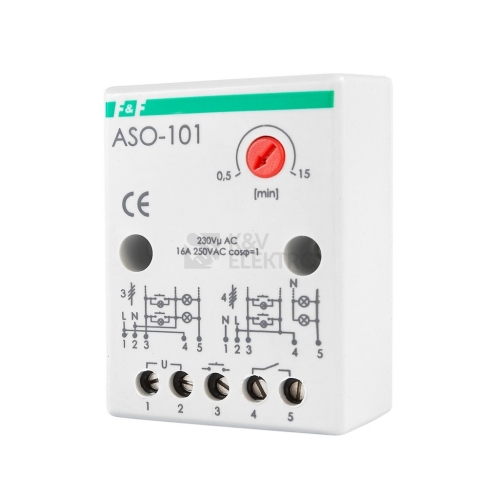 Automat schodišťový ASO-101, funkce protiblokády, zpoždění spínání 0 ,5-15min, spolupracuje s tlačítky vybavenými doutnavkami, proud 16A, barva šedá, krytí IP20, montáž na povrch.