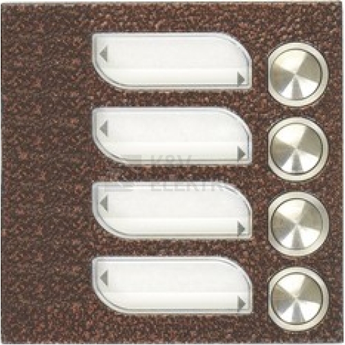 Popis: Modul obsahuje 4 vyzváněcí tlačítka se 4 jmenovkami pro vyzvonění příslušných DT a zámek pro uzamčení modulu v rámu. Barva: antika měděná