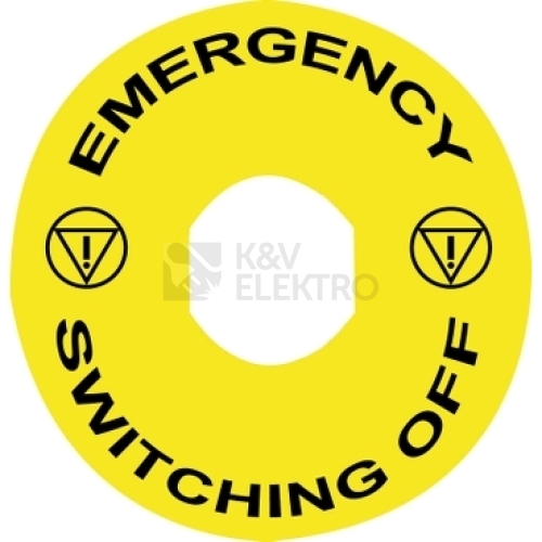 Tento kruhový štítek pro nouzové zastavení Harmony ZBY má žluté pozadí a je označen písmenem "EMERGENCY SWITCHING OFF"a průměrem 60 mm. Je kompatibilní s tlačítky a kontrolkami Harmony XB4, XB5 a XB7. Tento kruhový štítek jasně popisuje vaše nouzové vypínací jednotky. Je dodán již gravírovaný s označením odpovídajícím provozu stroje a je kompatibilní s jednotkou nouzového zastavení nebo vypnutí Harmony. Na štítku je vyznačeno zřetelné a pružné značení symbolů s vysokým kontrastem.