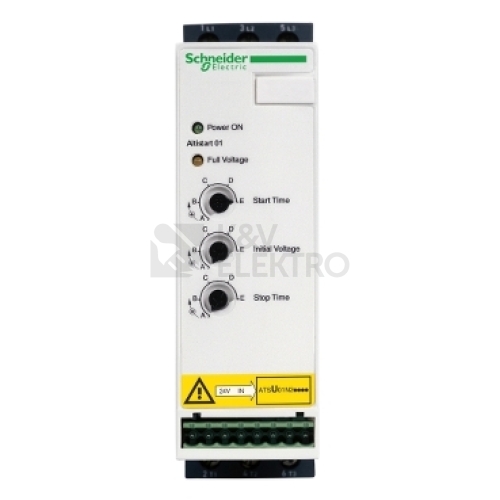 Altistart U01 je jednotka soft start/stop pro 3fázové asynchronní motory. Je určen především pro kombinace s motorovými spouštěči TeSys U. Lze jej použít pro jmenovitý výkon motoru do 11 kW nebo 15 hp v třífázovém (200 V až 480 V AC) a až do 22 A jmenovitého výkonu. Má šířku 45 mm, a proto je jedním z nejmenších soft startérů na trhu. Lze jej instalovat téměř všude. Nabízí integrovaný bypass, což snižuje hluk a snižuje tepelné ztráty. Její index ochrany je IP20. Váží 0,49 kg a jeho rozměry jsou 45 mm široké, 314 mm vysoké, 170 mm hluboké. Altistart U01 je navržen pro následující jednoduché aplikace, jako jsou dopravníky, dopravníkové pásy, čerpadla, ventilátory, kompresory, automatické dveře a brány, malé jeřáby a stroje na bázi pásu. Splňuje normy IEC/EN 60947-4-2 a přenáší certifikáty ULG, CSA, C-Tick a CCC a označení CEC. Prostřednictvím napájecího konektoru VW3G4104 lze jej snadno kombinovat s řadičem TeSys U. Na DIN lištu lze snadno nainstalovat. Altistart 01 kombinuje jednoduchost s jednoduchou kabeláží, rychlou konfigurací a efektivitou. Zkrácení doby opotřebení stroje a minimalizace doby jeho údržby zajistí optimální provoz. Společně s TeSys modelem U poskytuje jedinečné řešení motorového spouštěče.