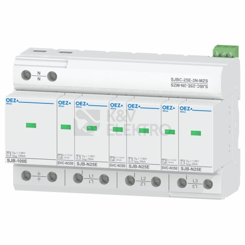Kombinovaný svodič bleskových proudů a přepětí, typ 1+2, Iimp 25 kA, Uc AC 350 V, zapojení 3+1, výměnné moduly, se signalizací, jiskřiště, varistor