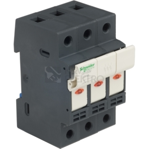 TeSys DF modulární držák pojistek, 3P (3P), pro ochranu ovládacích obvodů až do 32 A/690 V. Používá se s pojistkami 10 x 38 mm až 32 A a zkratovým proudem až na 120kA@400V. Kompaktní (šířka 52,5 mm), lze ji použít v modulárních panelech, nacvakáním na 35 mm lištu DIN, připojením šroubovými svorkami, uzamykatelný bez příslušenství. K dispozici jsou pojistkové spoje (10x38mm aM, typ gG) a pomocná zařízení (sady pro montáž pojistky, nacvakávací značky) (objednat samostatně). Prodává se v šarži 4 jednotek. Certifikováno více standardů (IEC, UL uznáno, CSA, CCC, EAC, Marine), produkt Green Premium (RoHS/REACh).