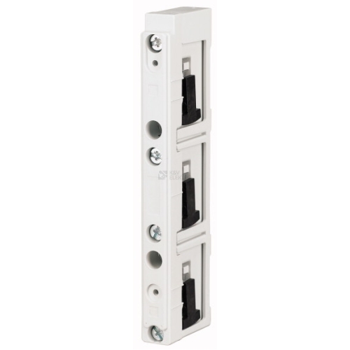 Držák sběrnic IEC, 60-mm systém, jmenovitý povozní proud Ie=630A, póly=3, použitelný pro 12x5/10, 20x5/10 a 30x5/10, s aretačním posuvným prvkem k přizpůsobení příslušné velikosti lišty, s uvnitř ležícími otvory k našroubování, odolný proti teplotám do 120 °C, odolnost proti plazivým proudům CTI 200, samozhášecí podle UL 94, RAL 7035, termoplast, bez obsahu silikonu, bez obsahu chlóru, bez obsahu halogenů, rozteč nosičů lišt odpovídá grafu odolnosti proti zkratu, UL schválená