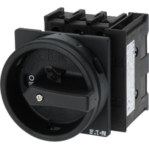 Hlavní spínač/vypínač podle IEC/EN 60947-3, 690V/32A, stupeň krytí vpředu IP65, rukojeť černá s blokovacím věncem černým, uzamykatelný v nulové poloze 3 visacími zámky, konstrukce zátěžových vypínačů P1 je velmi kompaktní a robustní. Ruční pohon působí na kontakty v přímém spojení. Při vypnutí se kontakty nuceně otevřou. Konstrukční formy všeobecně: Skříňky pro povrchovou montáž z izolačního materiálu, montáž, centrální upevnění, základní montáž, montáž do rozváděče IVS