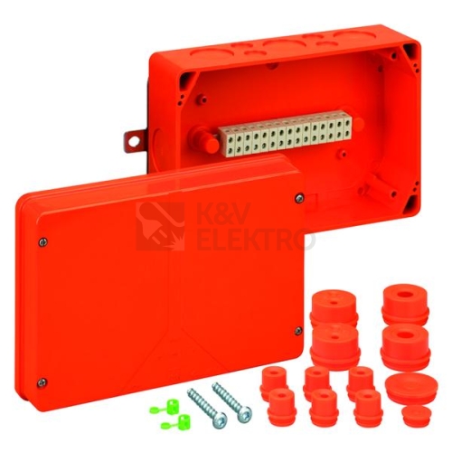 Kabelový rozbočovací box, se stupněm krytí IP54/IP65, Jmenovitý průřez 6mm², Ui=450V AC, Certifikováno podle VDE (DIN EN 60670-1/-22 (VDE 0606-1/-22)), Vyrážecí membrány, M20/M40, (16 z boku), Vnější místa pro připevnění, se zachováním elektrické funkčnosti E30-E90 podle DIN 4102 část 12. Skříň bez halogenů ze speciálního duroplastu, svorky ze speciální keramiky odolávající vysokým teplotám., oranžová, Spojovací krabice 15-pólová 0,5-6mm², počet svorkovatelných vodičů na pól: 8 x 0,5² / 4 x 0,75² / 6 x 1² / 6 x 1,5² / 2 x 2,5² / 2 x 4² / 2 x 6², Rozměry: 171 x 256 x 106mm, Přiložené příslušenství: 6 vývodek M20, Rozsah těsnění 8-13mm, 2 průchodky IP54 M40, Rozsah těsnění 17-30mm, 2 dvojité vývodky M40, Rozsah těsnění 17-30mm, 1 zaslepovací zátka M20, Rozsah těsnění 8-13,5mm, 1 zaslepovací zátka M40, Rozsah těsnění 17-30mm, Vrtací šablona, připevňovací sada na stěnu a strop D6, Plombovací souprava