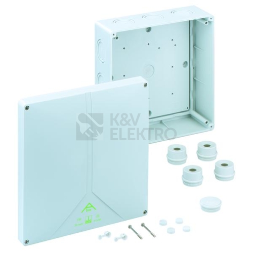 Spojovací krabice, se stupněm krytí IP54/IP65, Jmenovitý průřez 35mm², Ui=690V AC, Certifikováno podle VDE (DIN EN 60670-1/-22 (VDE 0606-1/-22)), Vyrážecí membrány, M25/M32/M40/M50, (2 ze zadu, 12 z boku), Vnitřní místa pro připevnění, pro standardní instalace ve vnitřním prostoru, šedá, bez svorek, Rozměry: 250 x 250 x 115mm, Přiložené příslušenství: 4 Vývodka IP54 M40 Rozsah těsnění 17-30mm, 1 Zaslepovací zátky M40, 1 Plombovací souprava
