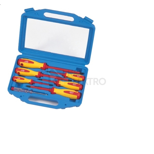7-DÍLNÁ SADA IZOLOVANÝCH ŠROUBOVÁKŮ DO 1000V A FÁZOVÉ ZKOUŠEČKY V PLASTOVÉM KUFŘÍKU Ploché šroubováky: 0.5x3.0x80mm 1.0x5.5x125mm 1.2x6.5x150mm Křížové šroubováky: PH0x75mm PH1x75mm PH2x100mm Fázová zkoušečka 145mm (120V-250V)