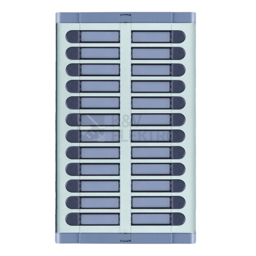 Tlačítkový panel řady 925 s 22 tlačítky ve 2 sloupcích. Včetně instalační krabice pod omítku. Panely jsou tvořeny poměrně silnou čelní deskou z eloxovaného hliníku, zakončenou na horní a dolní straně plastovými lištami.