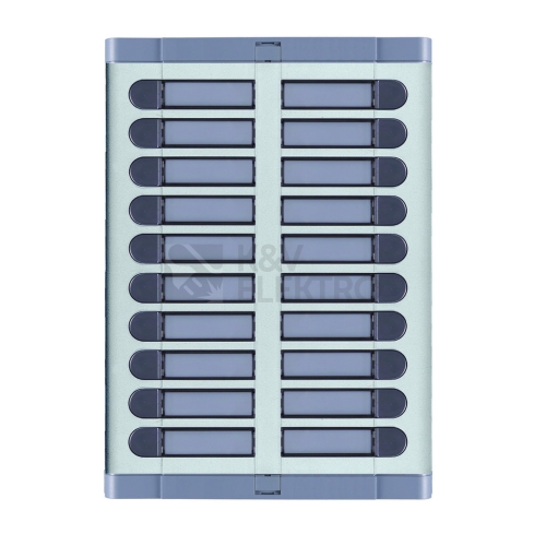 Tlačítkový panel řady 925 s 20 tlačítky ve 2 sloupcích. Včetně instalační krabice pod omítku. Panely jsou tvořeny poměrně silnou čelní deskou z eloxovaného hliníku, zakončenou na horní a dolní straně plastovými lištami.