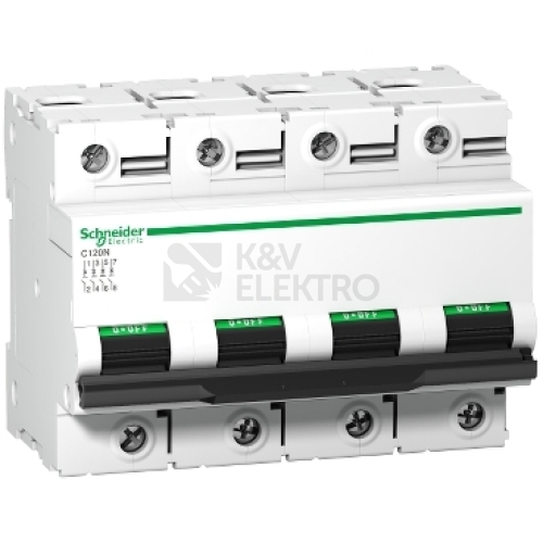 Acti 9 C120N je nízkonapěťový multistandard jistič. Jedná se o 4P jistič s 4 chráněnými póly, jmenovitým proudem 80 A a vypínací charakteristikou C. Jmenovitá zkratová vypínací schopnost dosahuje hodnoty 10000 A při 230 V stř. na 400 V AC dle normy EN/IEC 60898-1 a 10000 A při 230 V dle normy EN/IEC 60898-1. Splňuje jak průmyslovou normu ENE/IEC 60898-1, tak normu ENE/IEC 60947-2. Tento modulární jistič chrání obvod proti zkratu a přetížení. Přítomnost zelených proužků se fyzicky otevírá a umožňuje bezpečnou práci v přiřazeném obvodu. Má dobrou odolnost proti přepětí. Produkt je navržen tak, aby nabízel vysokou úroveň průmyslového výkonu Má elektrickou výdrž až 5 000 cyklů a mechanickou odolnost až 2 000 cyklů. Provozní napětí Ue jde z 380 VAC na 415 VAC. Jmenovité izolační napětí Ui je 500 VAC. Její třída omezení 3 (podle normy EN/IEC60898-1) zvyšuje náklady na ochranu přiřazeného obvodu. Lze jej nainstalovat na lištu DIN. Jeho šířka je 12 rozteč 9 mm. Stupeň znečištění je 3. Kategorie přepětí je IV. Barva produktu je bílá (RAL9003). Rozměry jsou (Š) 108 mm x (V) 81 mm x (H) 73 mm. Hmotnost je 0,82 kg. Má stupeň ochrany IP20 (podle IEC/EN 60529) na svorkách. Provozní teplota je -25 až 70 °C. Skladovací teplota je -40 °C až 85 °C.