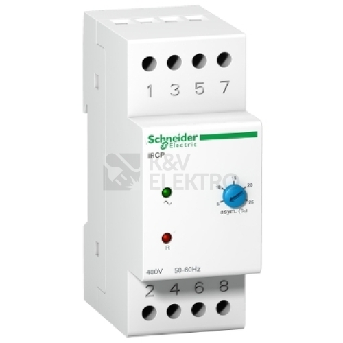 Tento Acti 9 iRCP je relé pro řízení fáze. Rozsah měření napětí je 0,15 V stř. až 10 V stř. Monitoruje fáze a přítomnost napětí na 3fázovém napájení obvodu. Označuje také případnou ztrátu nebo inverzi fáze. Dodává 1 přepínací kontakt s ochranou proti selhání. Nastavení parametru je provedeno na předním panelu přímým nastavením měřítka pomocí šroubováku. Lze jej použít například k ovládání napájení 3fázového motoru. Přesnost displeje je +/- 10 % z plného rozsahu. Časové zpoždění pro vypnutí je 0,3 s. Napájecí napětí Uc je 400 V AC +/- 15 %. Provozní frekvence je 50 Hz nebo 60 Hz. Výstup přepnutí kontaktního proudu je 8A menší než 250VAC s cos phi rovno 1. Zelená kontrolka na přední straně ukazuje přítomnost napětí. Červená kontrolka signalizuje chybu. Spotřeba je 3 VA. Rozptýlený výkon je 2 W. Šířka v 9mm rozteč je 4. Stupeň ochrany je IP20. Rozměry jsou (Š) 36 mm x (V) 88,1 mm x (H) 65 mm. Provozní teplota je -5 až + 55 °C. Skladovací teplota je -40 °C až +80 °C.