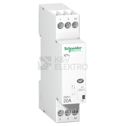 Acti9 iCT+ je nízkonapěťový modulární stykač s nízkým napětím. Zařízení pro dálkové ovládání 1P s 1 normálně otevřeným kontaktem. Jmenovitý proud je 20 A pro AC-7a a 20 A pro AC-7b. Hodnota provozního napětí Ue je 250 VAC. Řídící napětí Uc je 230 VAC. Díky své technologii křížení je ovládání osvětlení LED obzvláště přesné. Toto zařízení lze použít pro dálkové spínání osvětlení, malé motory (ventilátory, mixéry) nebo HVAC systémy. Tento produkt je v souladu s normou ENG/IEC 60669-2-2. Elektrická životnost dosahuje až 500 000 cyklů. Maximální počet spínacích operací je 6 za minutu. Jmenovité izolační napětí Ui je 300 V AC. Stupeň znečištění je 3. Lze jej nainstalovat na lištu DIN. Jeho šířka je 2 rozteč 9 mm. Barva produktu je bílá (RAL9003). Rozměry jsou (Š) 81 mm x (V) 18 mm x (H) 60 mm. Hmotnost je 70 g. Podle normy IEC 60529 je stupeň ochrany ve skříni IP20 a IP40. Provozní teplota je od -5 °C do 55 °C. Skladovací teplota je od -40 °C do 60 °C.