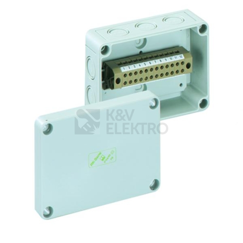 Skříň pro řadové svorkovnice, se stupněm krytí IP54/IP66, Jmenovitý průřez 4mm², Ui=400V AC, polystyren, Vnitřní místa pro připevnění, pro standardní instalace ve vnitřním prostoru, osazené 12-pólovou blokovou svorkou 4mm² (typ Contaclip BKA 4), Rozměry: 130 x 94 x 57mm, Přiložené příslušenství: 6 s vývodkami IP54 M20, rozsah těsnění 8-13,5mm