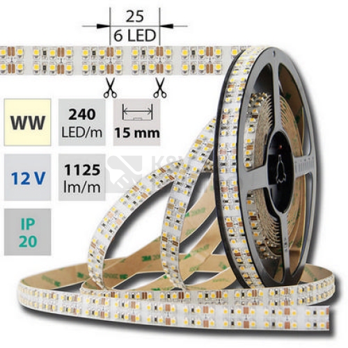 LED pásek SMD3528, 2800-3200K (teple bílá), 19,2W, 240LED, 1125lm, segment 25mm, 6LED/segment, IP20, DC 12V, životnost 25000h, šíře 15mm, bílý PCB pásek, max. délka pásku při jednostranném zapojení: 5m, opatřen samolepící páskou 3M.