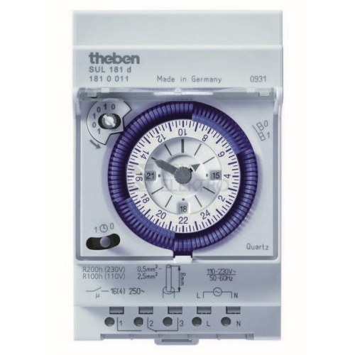 Název produktu: Spínací hodiny Typ: SUL 181 d Technický popis: analogové, denní spín. program Popis: 1kanálové, rezerva chodu 200 hod., přepínací kontakt, min. interval spínání 15min., provozní napětí 110-230V AC, bezšroubové svorky DuoFix, ruční spínač se 3 polohami: ZAP/VYP/AUTO
