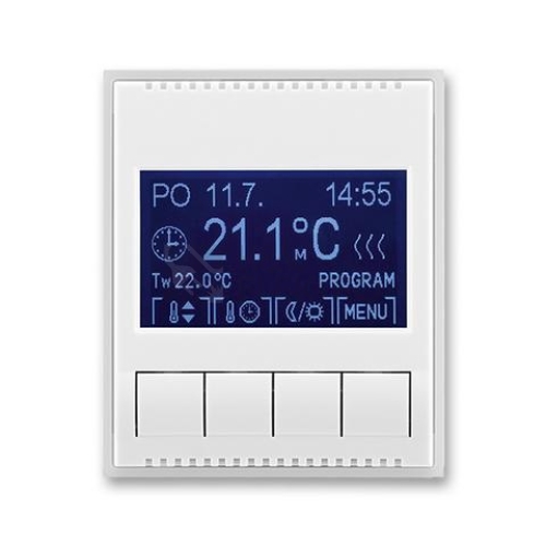 Šetřete náklady na topení a regulujte topnou techniku za pomoci termostatu. Vybírejte z termostatů bezdrátových, dotykových i s otočným knoflíkem či tlačítkem. Termostat univerzální programovatelný (ovládací jednotka) Ovládací jednotka (nutno použít spínací přístroj). Volitelná funkce prostorového, podlahového nebo kombinovaného termostatu. Nastavitelné teploty: 0 °C až +50 °C Provozní režimy: manuální, automatický (1 základní nebo 3 rozšířené časové programy), dovolená Základní program: volba ze 2 přednastavených teplot - komfortní a útlumové Rozšířený program: navíc možnost libovolně nastavitelné teploty Časový program: max. 70 časových značek s rozlišením 5 minut, pro jednotlivé dny v týdnu nebo Po-Pá, So-Ne, Po-Ne. Další funkce: softwarové vypnutí, volba topení nebo chlazení, jas a kontrast displeje, zámek tlačítek, volba teplotního snímače, minimální a maximální limitní teplota, vnější ovládání kontaktem, adaptivní regulace, funkce předvídání, omezení nastavitelných teplot, počítadlo provozních hodin, protimrazová ochrana, ochrana ventilů, inverze funkce výstupu, automatický přechod zimní/letní čas, volba jazyka (CZ, EN, RUS) Rezerva chodu: cca 90 dní (dobíjecí Li článek) Pracovní teplota: 0 °C až +50 °C Snímač teploty pro podlahové vytápění: 3292U-A90100 (není v dodávce) Design: Time®, Element® Barva: bílá/ledová bílá Tvar, který pohladí. Po celém domě v designové harmonii. Element®Time® jako dokonalý celek. Podívejte se i na další termostaty ABB a ostatní termostaty z naší nabídky.