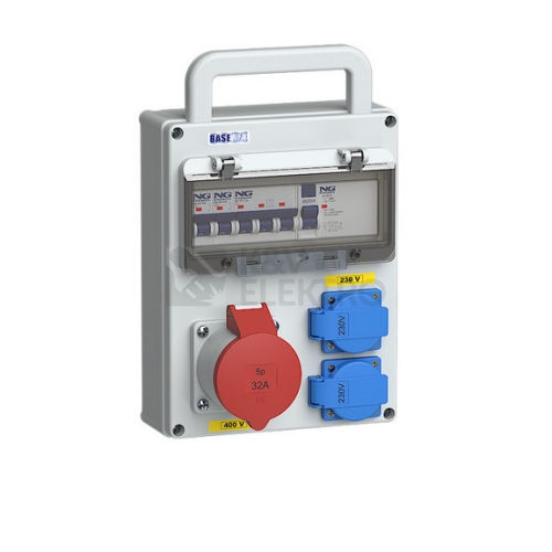 Zásuvková kombinace přenosná BASE LINE NGE 32 007 M.01 materiál pouzdra: plast, chráněno proti stříkající vodě IP 44, prodrátováno, zásuvky s ochranným kolíkem rozměr pouzdra 260 x 200 mm 1 zásuvka 32A 400V 5p 2 zásuvky s ochranným kolíkem 16A 230V~ 1 proudový chránič 40A/0,03A/4p 1 jistič char. C 32A 3p 2 jističe char. B 16A 1p přívod vedení: 1 x M 25 z boku