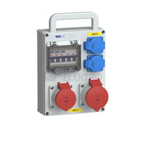 Zásuvková kombinace přenosná BASE LINE NGE 32 008 M.01 materiál pouzdra: plast, chráněno proti stříkající vodě IP 44, prodrátováno, zásuvky s ochranným kolíkem rozměr pouzdra 260 x 200 mm 1 zásuvka 32A 400V 5p 1 zásuvka 16A 400V 5p 2 zásuvky s ochranným kolíkem 16A 230V~ 1 jistič char. C 16A 3p 2 jističe char. B 16A 1p přívod vedení: 1 x M 25 z boku