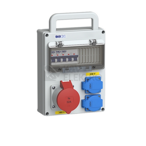 Zásuvková kombinace přenosná BASE LINE NGE 32 005 M.05 materiál pouzdra: plast, chráněno proti stříkající vodě IP 44, prodrátováno, zásuvky s ochranným kolíkem rozměr pouzdra 260 x 200 mm 1 zásuvka 32A 400V 5p 2 zásuvky s ochranným kolíkem 16A 230V~ 1 jistič char. C 32A 3p 2 jističe char. B 16A 1p přívod vedení: 1 x M 25 z boku