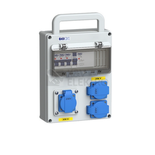 Zásuvková kombinace přenosná BASE LINE NGE 16 002 M.01 materiál pouzdra: plast, chráněno proti stříkající vodě IP 44, prodrátováno, zásuvky s ochranným kolíkem rozměr pouzdra: 260 x 200 mm 3 zásuvky s ochranným kolíkem 16A 230V~ 1 proudový chránič 25A/0,03A/4p 3 jističe char. B 16A 1p přívod vedení: 1 x M 25 z boku
