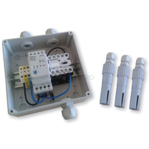Řešení regulace hladiny ve studnách a vrtech pro třífázová čerpadla. KOMPLET STD-3 obsahuje hladinové relé SSRC-04 s funkcí vyprazdňování, ministykač (9 A), tři detekční elektrody. Celý komplet je zapojený v krytu, je opatřen průchodkami. Vše ve stupni krytí IP55. POPIS ČINNOSTI Funkce – vyprazdňování a udržování rozmezí dvou hladin se 3 sondami: Po připojení provozního napětí při výši hladiny nad horní požadovanou úrovní (sonda U) sepne pracovní kontakt relé a spustí vyprazdňování. Po dosažení spodní požadované úrovně hladiny (pod sondou L) se pracovní kontakt relé rozepne. Sonda B musí být ponořena neustále. Umisťuje se pod spodní sondu L a slouží jako ochrana čerpadla proti chodu naprázdno.