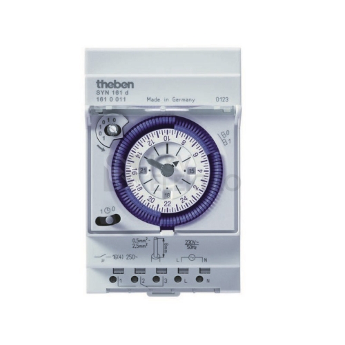 Segmentové analogové spínací hodiny SYNCHRONA 161d s 24-hodinovým cyklem. FUNKCE: volba stavu sepnutí – vypnutí / ruční nastavení, segmentové kolečko pro nastavení programů, segmenty (1=15 min.) na 1 nastavení nastavte minimálně 2 segmenty, ukazatel času: dopoledne / odpoledne (AM / PM ), ukazatel hodin (hodina a minuta) je možno nastavit ve směru i proti směru chodu hodinových ručiček, 3polohový přepínač: trvale sepnuto – AUTO – trvale vypnuto.