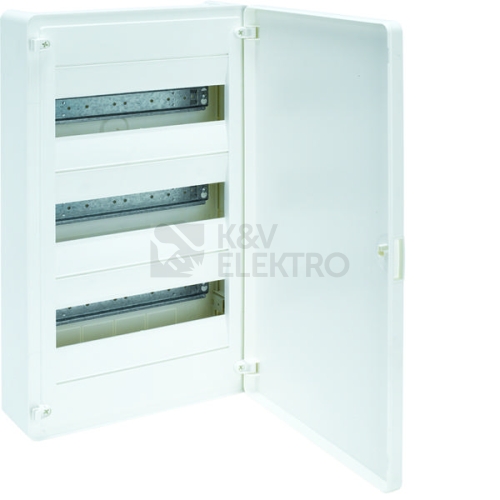 Vnější rozměry: 500 x 282 x 99 mm Vstup do rozvodnice může být jednotlivými kabely, nebo lištou. Dveře umožňují pravou nebo levou montáž. Změna směru otevírání bez nutnosti demontovat kryt. Dveře se otvírají o 180°. Technická data: Třída izolace II Barva bílá (RAL 9010) Jmenovitý proud: pro přístroje do 63A Jmenovité napětí: AC400 V / 50Hz Testováno žhavou smyčkou 650°C Mosazná svorkovnice PE + N Zaslepovací krytky Přímé uchycení DIN lišt na zadní stěnu skříně nechávající dostatečný prostor pro kabeláž Úchytné body pro fixaci vodičů jsou součástí skříně Nový patentovaný popisový systém Baleno v kartonu IP30 při otevřených dveřích IP40 při zavřených dveřích IK07