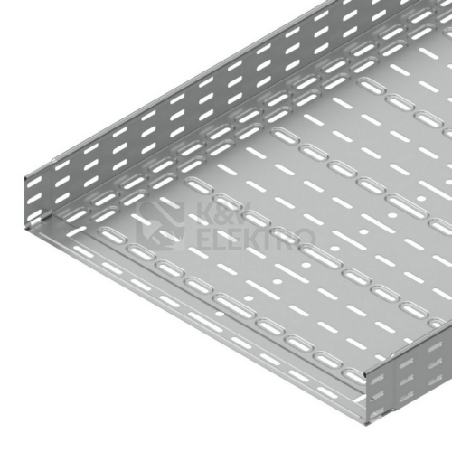 Kabelový žlab s integrovanou spojkou KZI 85x600 z plechu tloušťky 1,25 mm v povrchové úpravě sendzimir, děrovaný, opatřený embosy pro zvýšení pevnosti a tuhosti.